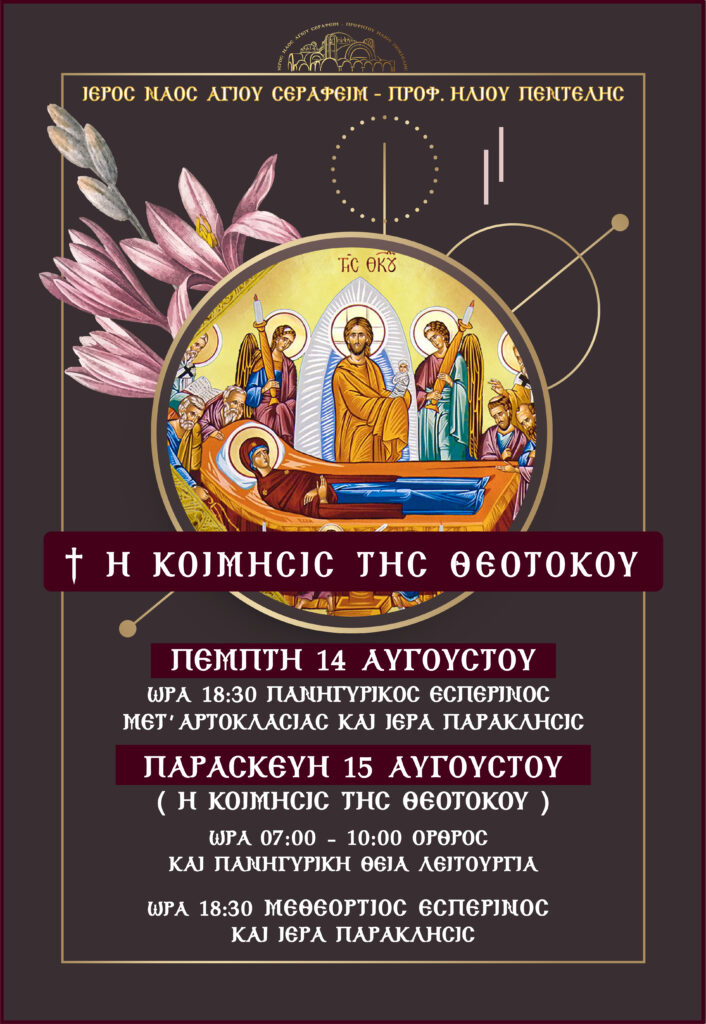 Category: UncategorizedBy Stella14 Αυγούστου, 2025 Author: Stella Post navigationPreviousPrevious post:Ιερά Πανήγυρις Προφήτου Ηλιού ΘεσβίτουNextNext post:Κατηχητικά ΣχολείαRelated PostsΑπόδοσις Της Εορτής Των Χριστουγέννων29 Δεκεμβρίου, 2025Χρόνια Πολλά και Ευφρόσυνα!29 Δεκεμβρίου, 2025Χριστούγεννα Στον Άγιο Σεραφείμ29 Δεκεμβρίου, 2025Ιερά Αγρυπνία Επί Τη Εορτή Του Αγίου Σπυρίδωνος Τριμυθούντος Του Θαυματουργού9 Δεκεμβρίου, 2025Μουσική Συναυλία30 Νοεμβρίου, 2025Ιερά Πανήγυρις27 Νοεμβρίου, 2025
