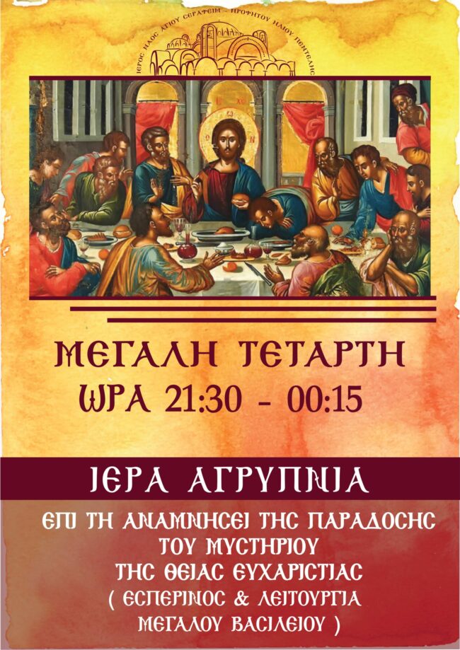 Ιερά Αγρυπνία Επί Της Παράδοσης Του Μυστηρίου Της Θείας Ευχαριστίας UncategorizedBy Stella12 Απριλίου, 2023